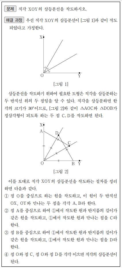 3. 다음은 어느 예비교사가 수학 교육론 강의 시간에 분석법을 이용하여 직각의 삼등분선의 작도 문제를 해결한 과정이다.