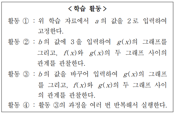 4. 최 교사는 ‘기울기가 같은 두 일차함수의 그래프는 서로 평행하거나 일치한다’는 학습 내용을 지도하려고 한다. 다음은 최 교사가 수업에 사용하기 위해 만든 학습 자료와 그 학습 자료를 활용한 학습 활동과 평가에 대한 계획이다.