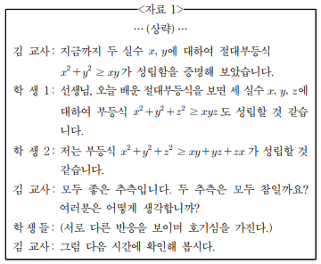 5. <자료 1>은 절대부등식을 증명하는 수업 과정에서 학생이 새로운 추측을 제기하는 상황이다.