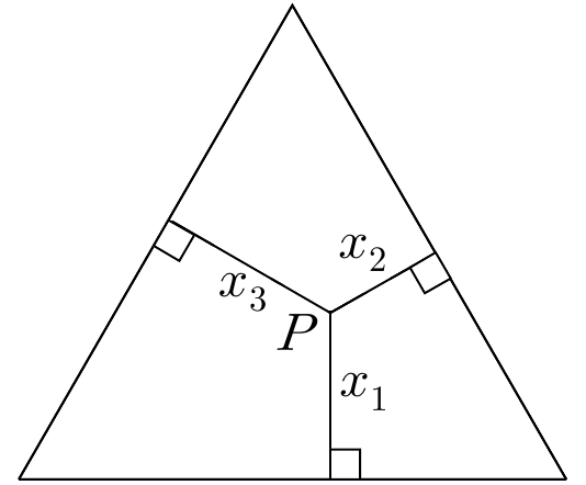 라 하고 확률변수 를 라 하자. 의 누적분포함수(cumulative distribution function) 라 할 때, 함숫값 을 풀이 과정과 함께 쓰시오. [서술형, 3점] 4. 그림과 같은 정삼각형 내부에 있는 임의의 점 에서 각 변까지의 거리를 각각 , , 라 하자. 이 때, , , 가 삼각형의 세 변의 길이가 될 확률을 구하시오. [서술형, 4점]