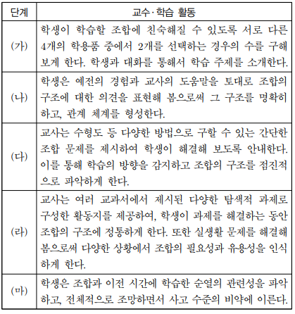 1. 김 교사는 반 힐레(P. van Hiele)의 수학 학습 수준 상승을 위한 교수․학습 단계를 적용하여 고등학교 조합 단원의 수업을 계획하였다. 다음은 김 교사가 계획한 수업 과정을 순서 없이 나열한 것이다. 교수․학습 단계에 따라 (가)~(마)를 순서대로 배열하고, (마) 단계의 명칭을 쓰시오.[2점]