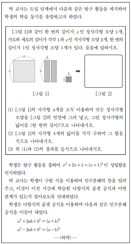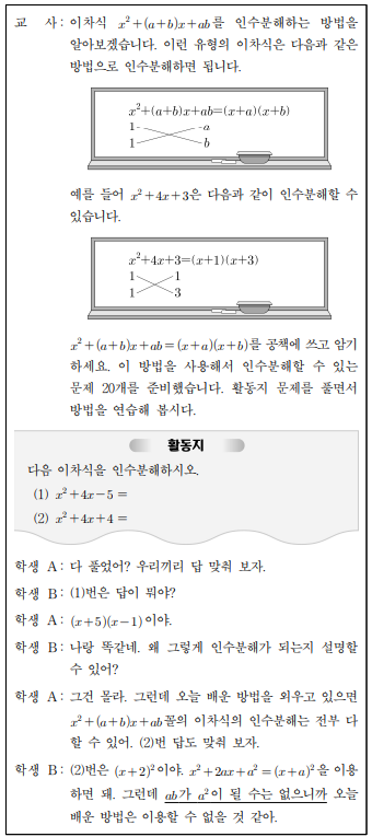 4. 다음은 ‘이차식의 인수분해’에 대한 중학교 수업의 일부이다.