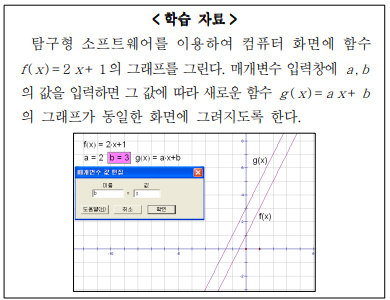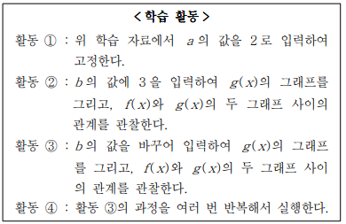 5. 최 교사는 “기울기가 같은 두 일차함수의 그래프는 서로 평행하거나 일치한다”는 학습 내용을 지도하려고 한다. 다음은 최 교사가 수업에 사용하기 위해 만든 학습 자료와 그 학습 자료를 활용한 학습 활동에 대한 계획이다.
