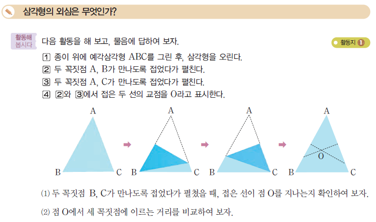 8. 다음은 중학교 2학년 삼각형의 외심에 대해 다음과 같은 활동을 한 후 형식적인 정당화를 하였다. 다음 학생과 교사가 대화하는 것을 보고 다음에 답하시오.