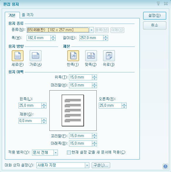 ■우선, 편집 용지는 추후 학술지로 엮어서 인쇄를 해야 하므로 모두 똑같이 해야 한다. 용지 종류와 용지 여백 위, 아래, 오른쪽, 왼쪽 등을 위와 같이 맞추어 준다.