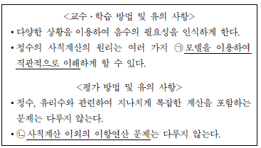 5. 다음은 2015 개정 교육과정에 따른 중학교 수학과 교육과정의 수와 연산 영역에 제시된 <교수․학습 방법 및 유의 사항>과 <평가 방법 및 유의 사항>의 일부이다.