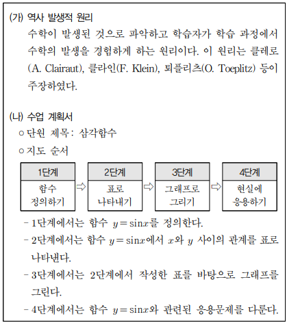 7. 다음은 역사 발생적 원리에 대한 설명과 예비 교사가 작성한 수업 계획서의 일부이다.