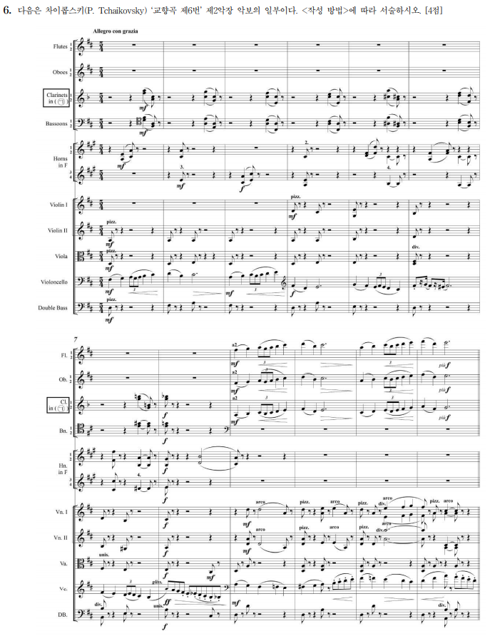 ◦ ㉠에 들어갈 영문 표기를 쓸 것. ◦ 제시된 악보에서 주제 선율을 연주하는 악기를 모두 쓸 것. ◦ 이 악보를 지휘할 때 5박의 분할을 쓰고(예 : ○박+○박), 그 근거를 악보에서 찾아 1가지를 서술할 것.  |