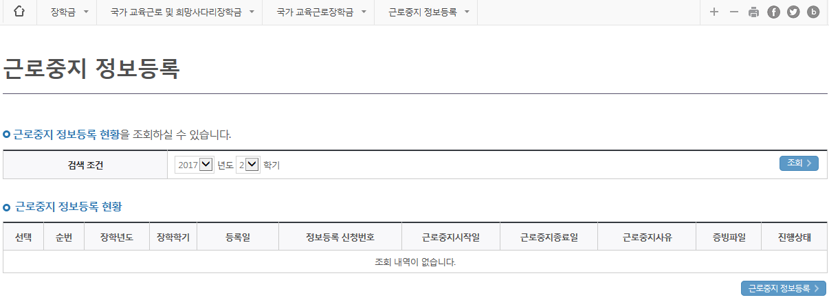※한국장학재단 홈페이지 접속 > 장학금 > 국가 교육근로 및 희망사다리장학금 > 국가 교육근로장학금 > 근로중지 정보등록