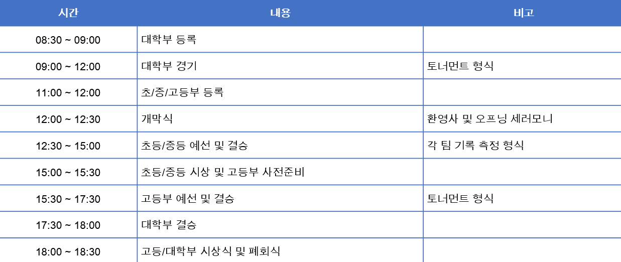 ※ 초,중,고등팀은 지도교사 필수이며, 고등팀은 지도교사의 현장 참가는 의무사항 아니고 권장사항임.