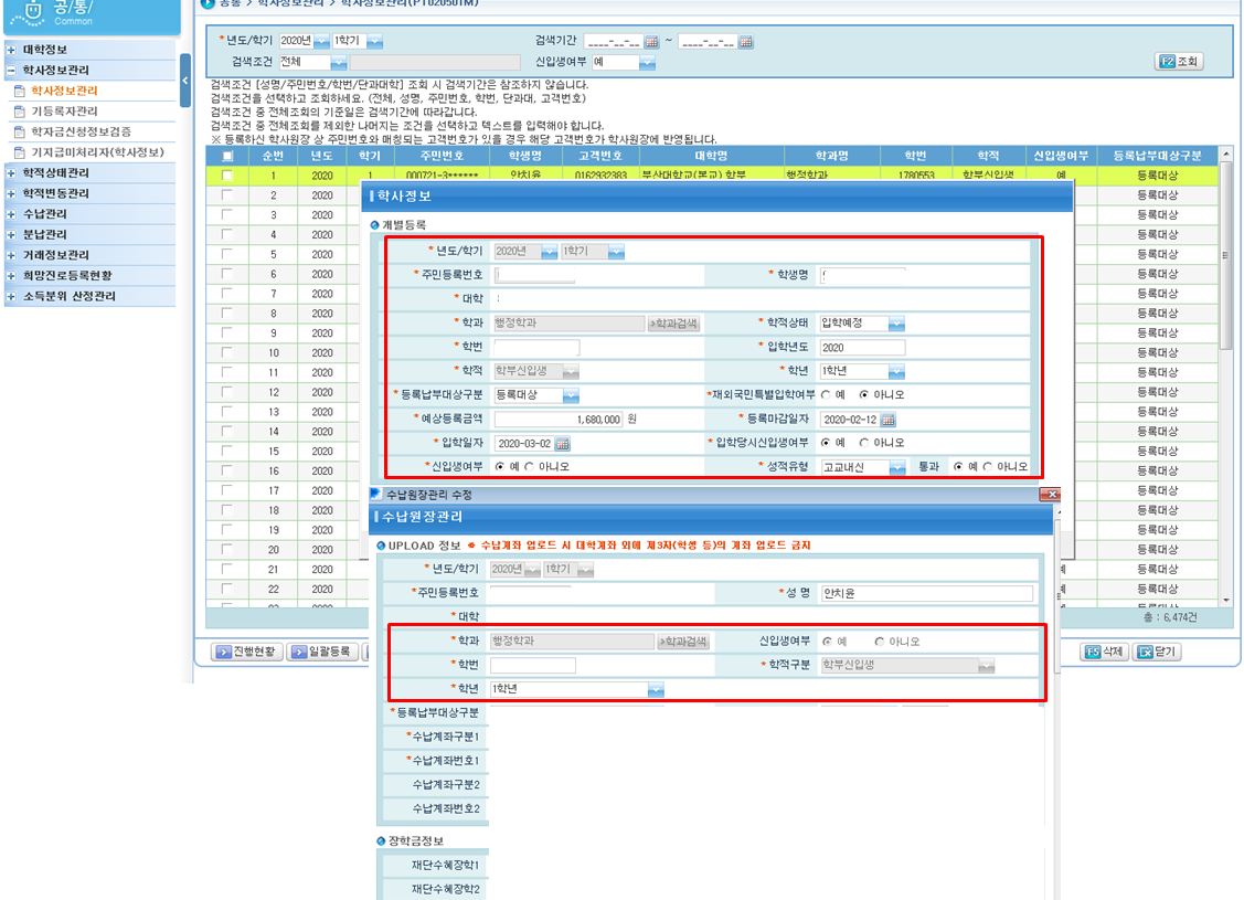 ㅇ 학사원장 및 수납원장이 확인되는 경우, 학사/수납원장 상 학적, 학년, 학번 등 인적사항 정보가 서로 불일치하는지 확인