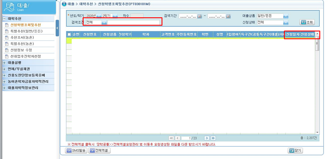 ㅇ [관리자포털>대출>대학추천>신청학생조회및추천]에서 학생 조회
