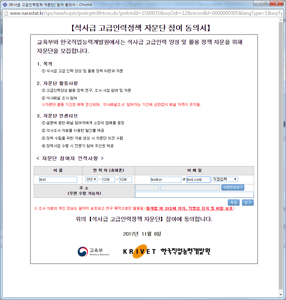 - [자문단 참여 동의서  ] 조사표 저장완료 후 입력 및 조회 가능