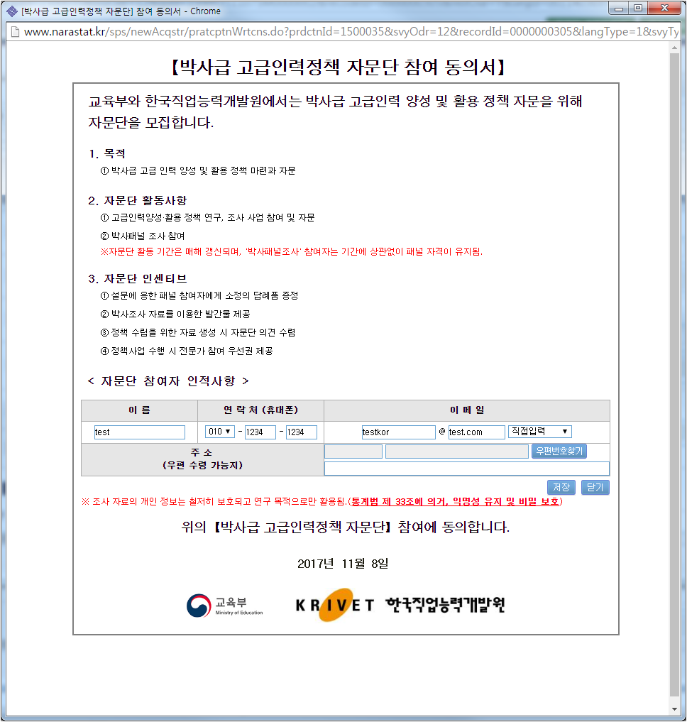 - 초기 조사표 입력 저장 하면 후 [자문단 참여동의서] 팝업화면 자동 활성화