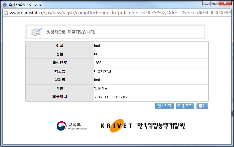 - [조사 완료증  ] 조사표 저장완료 후 출력 및 파일다운로드 가능