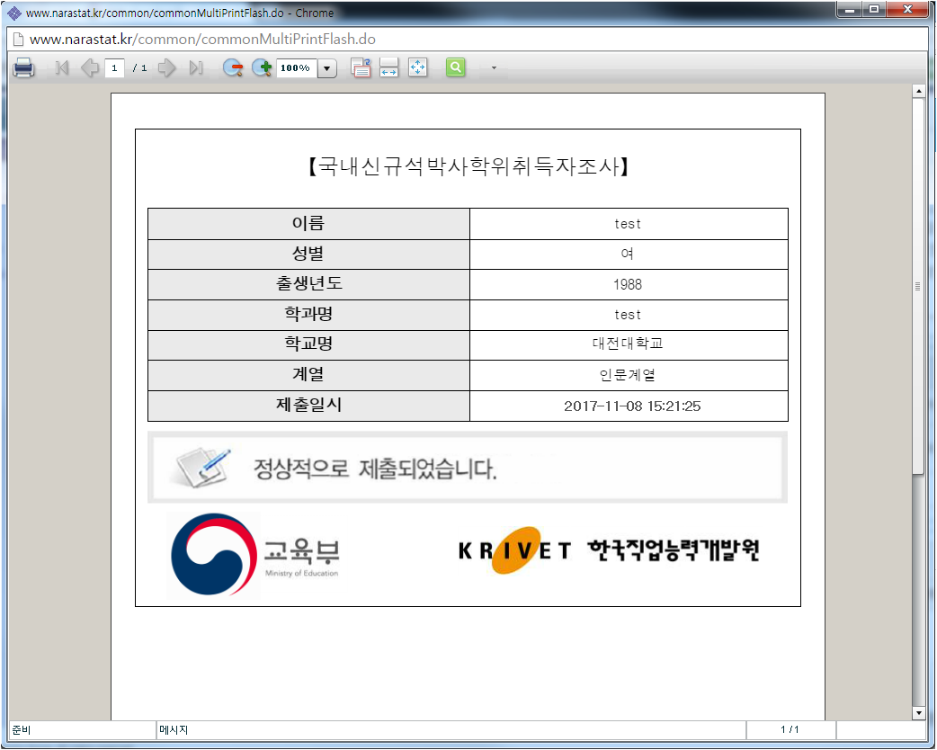 - [인쇄하기  ] : 조사 완료증을 인쇄하여 제출