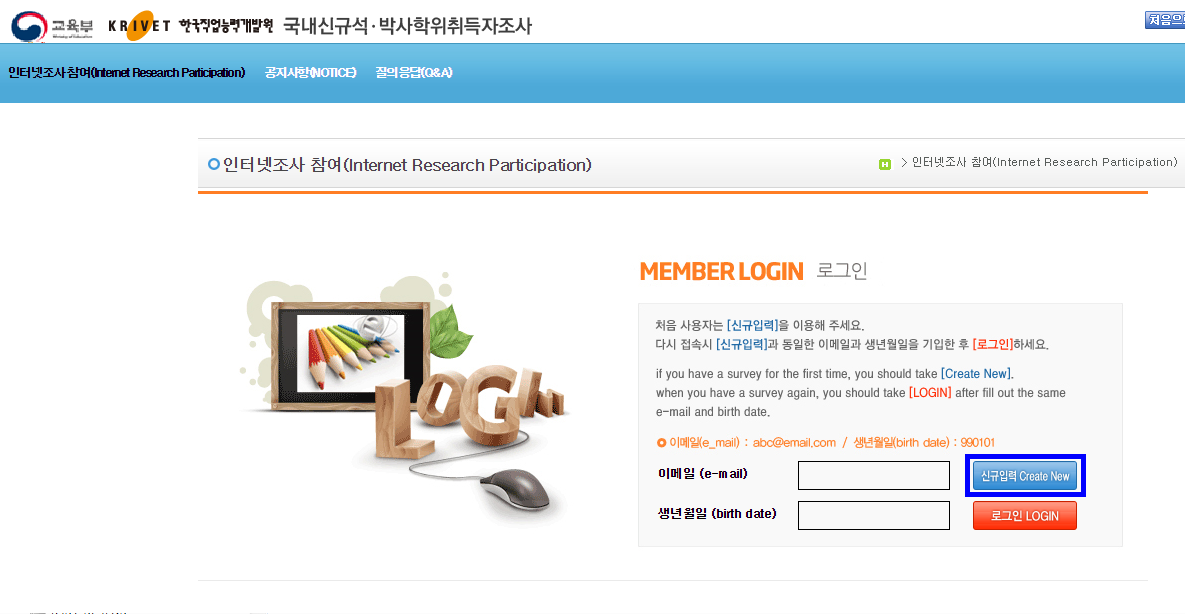 - 조사에 참여한 적이 없는 사용자는 신규입력( )을 이용해 조사 참여가능