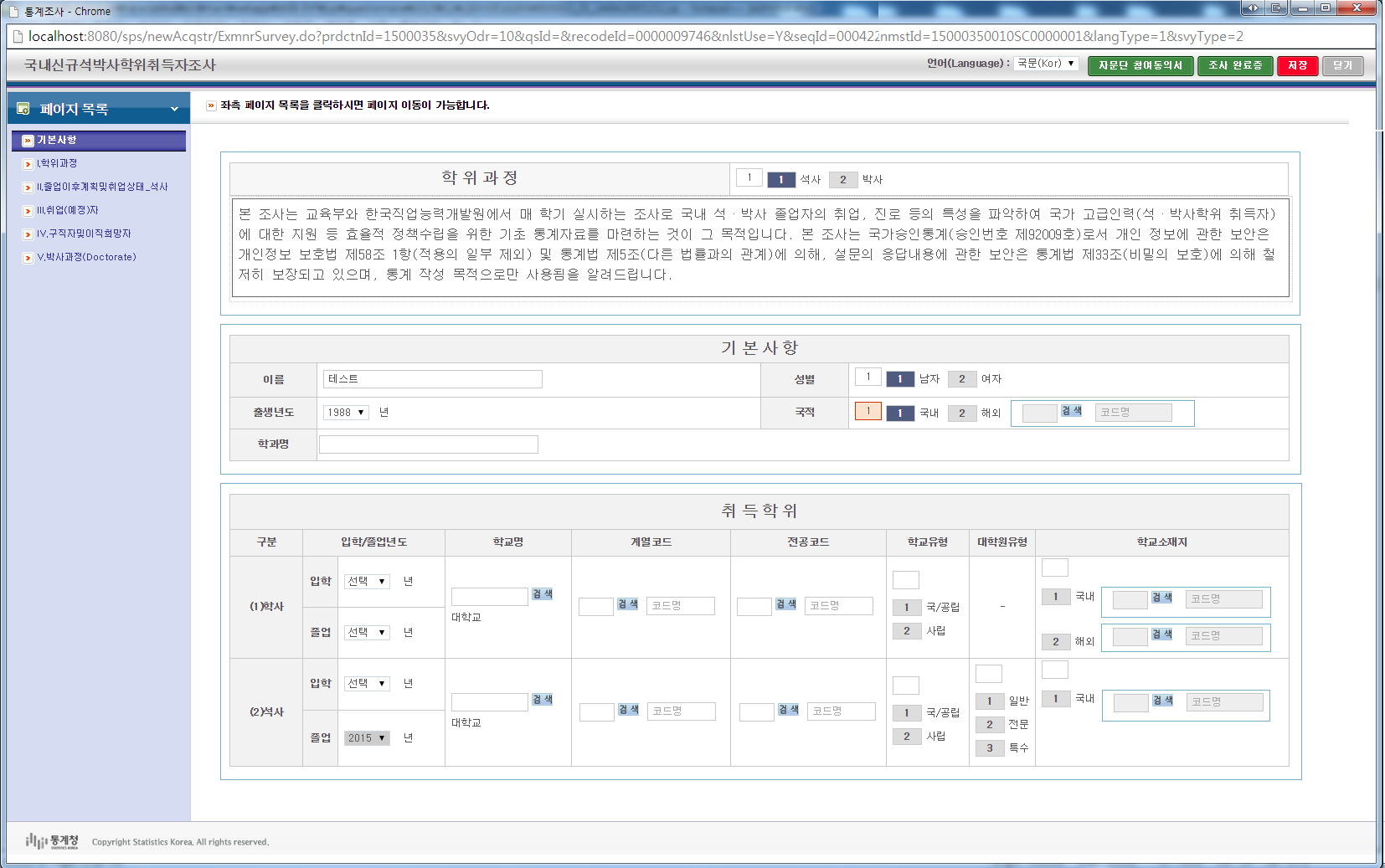 - 로그인 성공하면 [신규입력]에서 선택된 언어에 따라 국문 또는 영문 조사표가 조회되어 자료 입력 가능