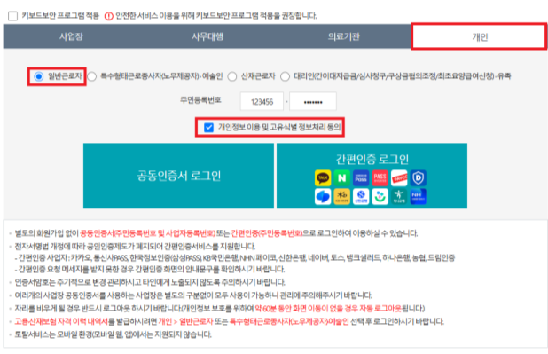 ➋ 개인 → 일반근로자 선택 ⟶ 간편인증 또는 공동인증서 이용 로그인