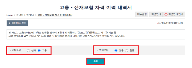 ➌ ‘고용⸱산재보험 자격 이력 내역서’ 선택
