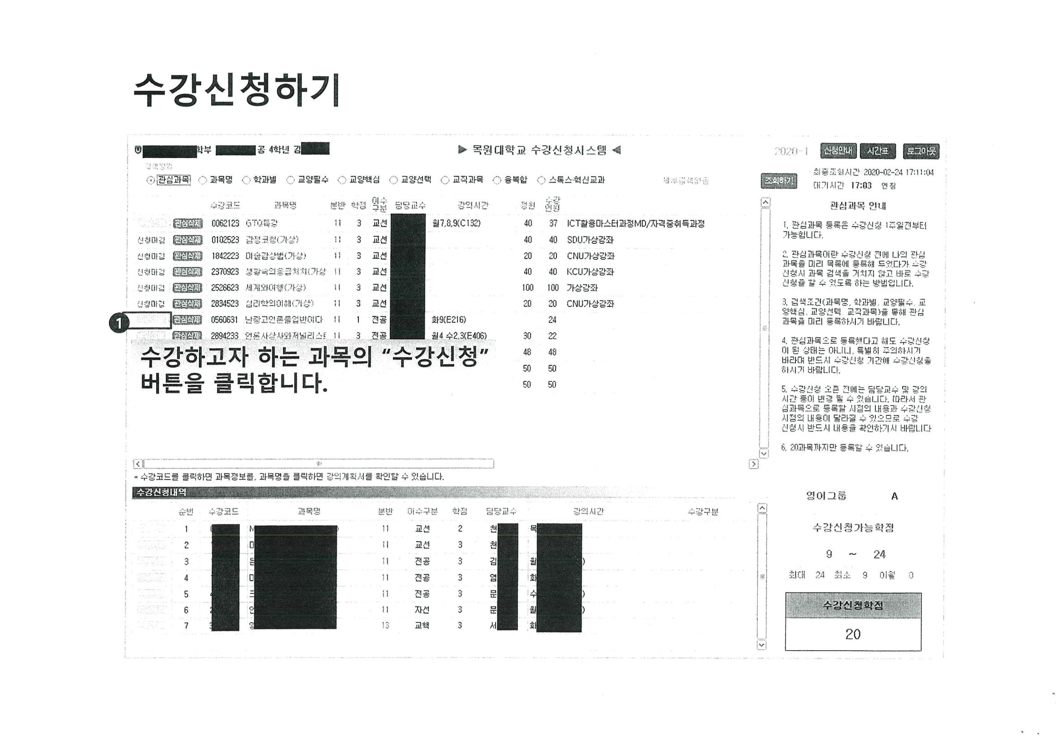 *우선은 ①번 전공과목, ③교양핵심 ④교양선택과목 수강신청 후 개강(3.16일)이후 ②교양필수과목 신청./ 1학년 수강신청 학점은 학기당 20학점까지 신청가능.