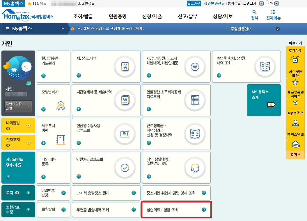 ○「My 홈택스」 화면에서 ‘실손의료보험금 조회’ 메뉴를 선택합니다.