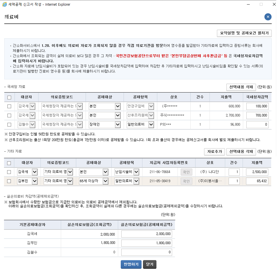-공제신고서 작성 시(또는 공제신고서 초기화) 조회한 금액이며, 조회 금액이 실제와 다른 경우에는 수정이 가능합니다.
