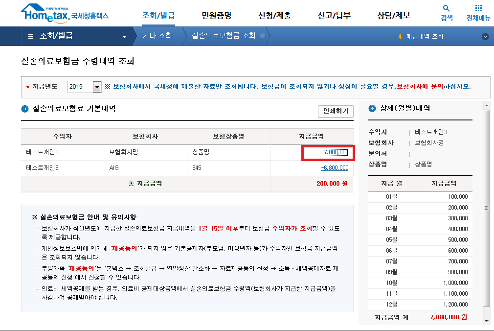 ○지급금액을 클릭하면 월별 상세내역이 조회되며, 부양가족이 동의하는 경우 부양가족의 자료도 조회 가능합니다.