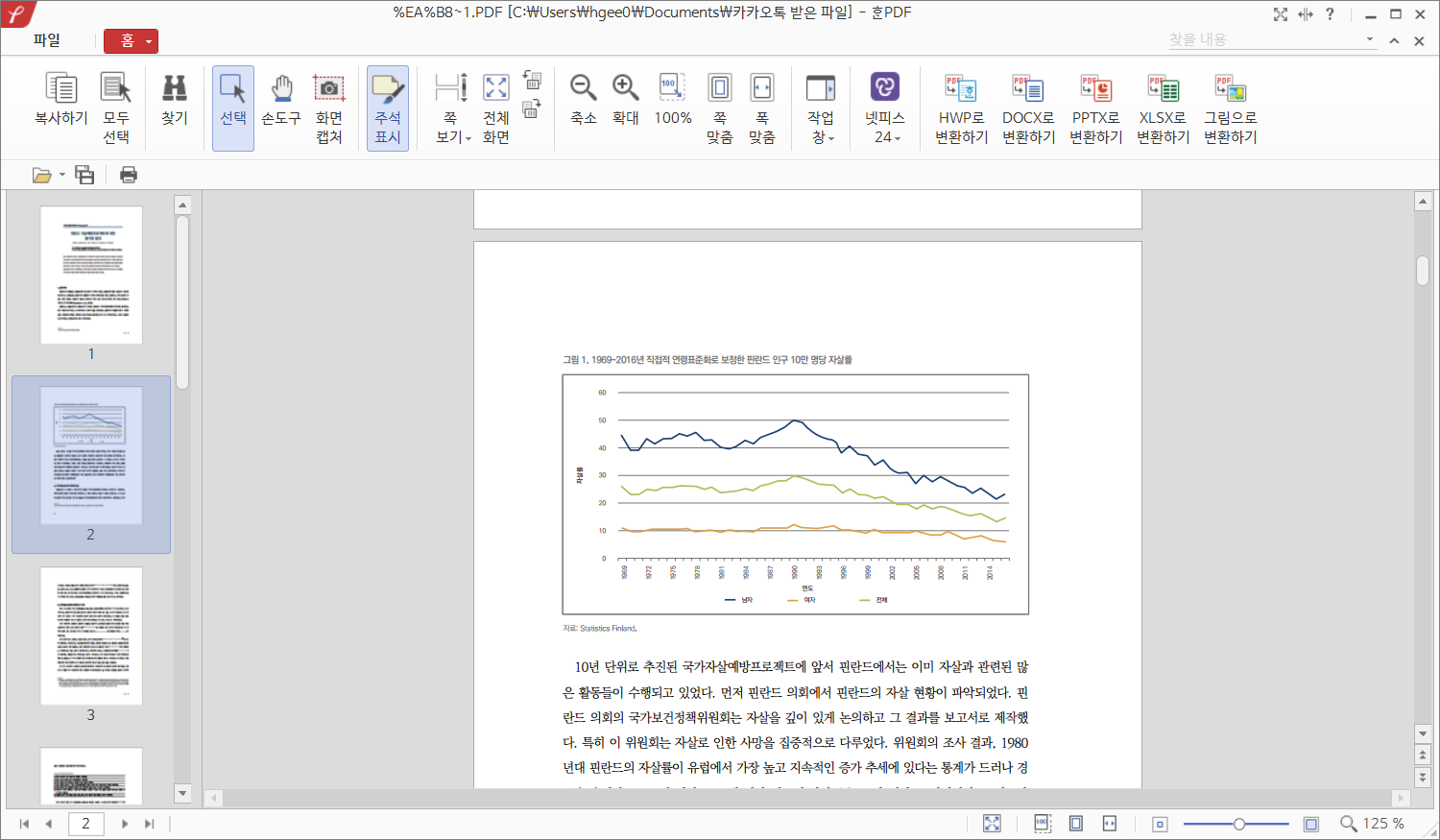 핀란드의 자살률은 1990년부터 감소하기 시작해 지금은 1990년의 절반 수준으로 떨어졌다(그림 1). 1990년은 핀란드의 자살률이 역사상 최악이었던 해다. 핀란드는 1751년부터 자
