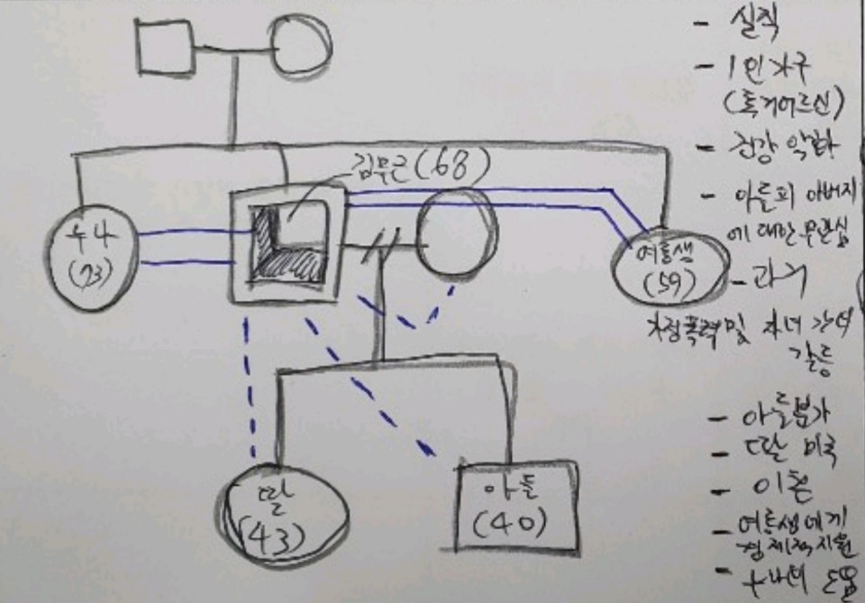 “15년 전 배우자와 이혼 후 재작년까지 재결합 이야기가 있었으나 무산되었다.(아쉬운 표정을 지음)” “건강악화로 친구들의 방문을 거부하고 외부 활동을 중단한 채 술, 담배로 집 안에서만 생활하고 대화도 잘 하지 않으려고 한다.” |