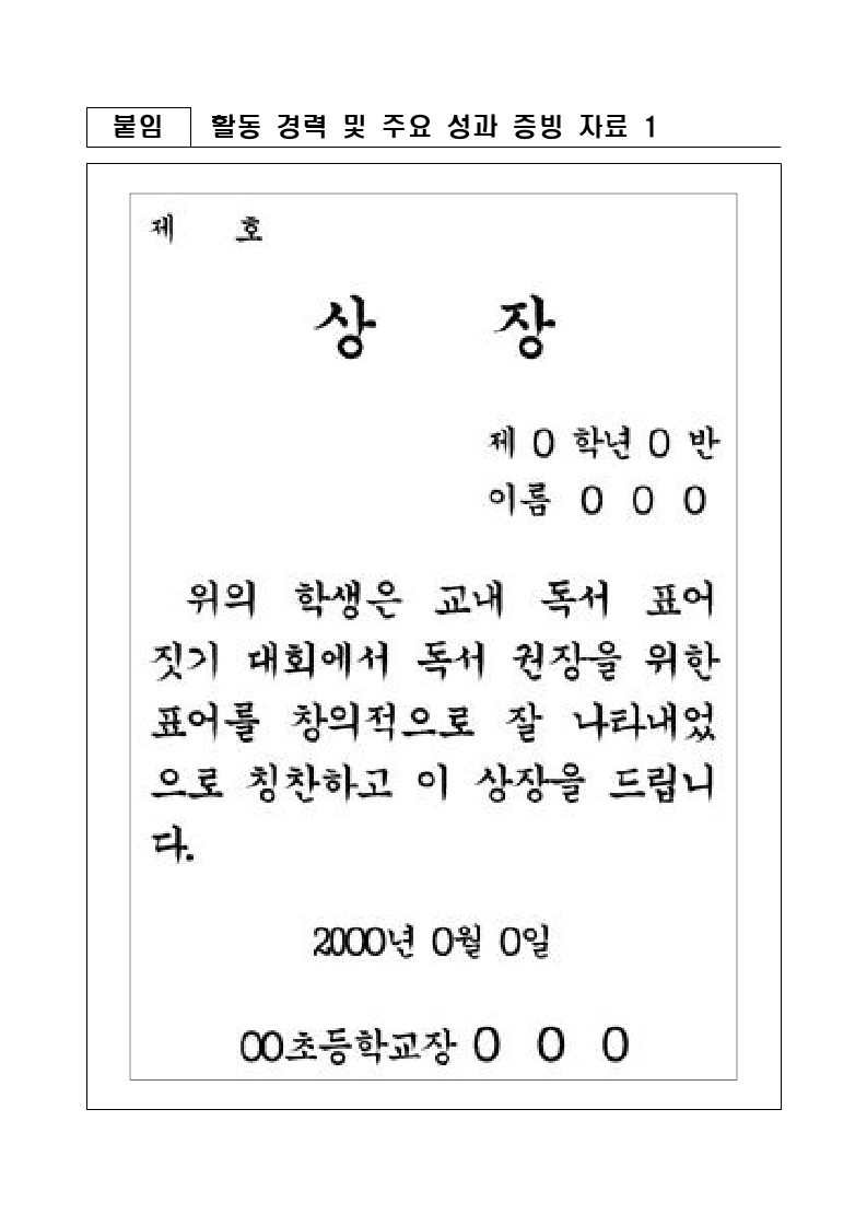 예시) ◦ 전국 고등학생 토론대회 대상(국무총리상) (증빙1)