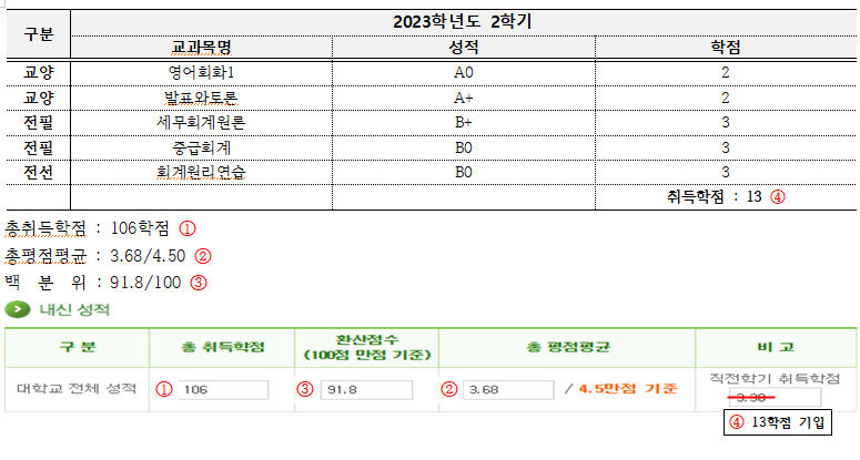 ※1학년은 고3 성적만 적용하고 2학년 이상은 성적증명서상 대학 전체 성적(환산점수) 반영