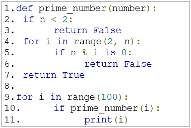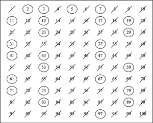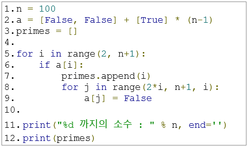 1부터 100까지의 표에서 합성수를 지워 찾은 결과를 사진으로 나타낸 것이다. 이를 코드의 형태로 나타내면 다음과 같다.