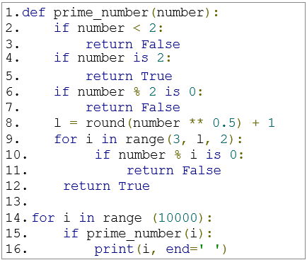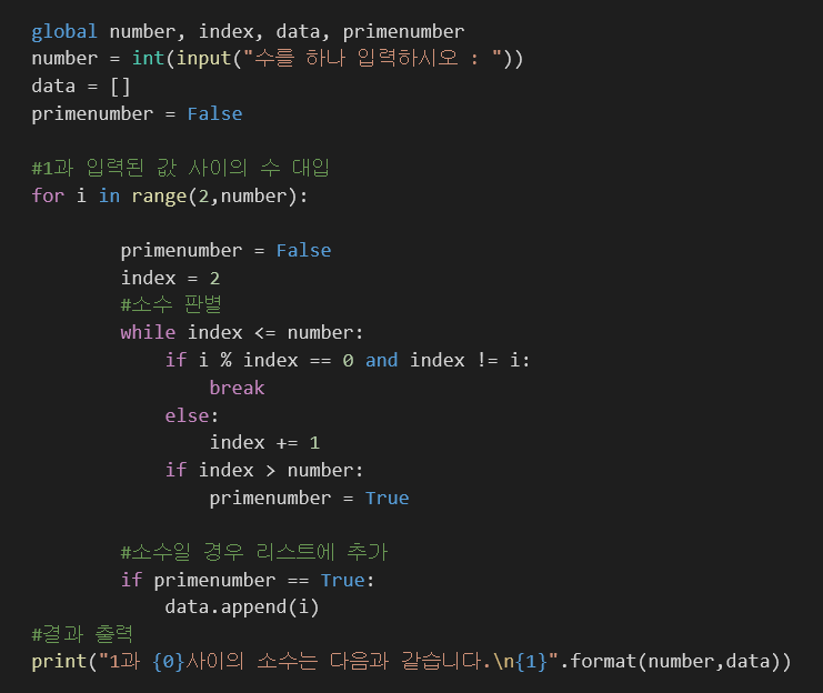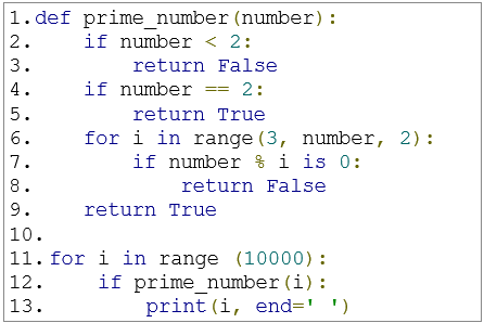 현재는 for문에서 전체 범위를 결정하고, while문을 통해서 소수를 찾을 때 까지 연산을 하는 과정을 거치고 있다. 100 정도 범위의 수의 경우에는 모르지만 10,000 정도의 수만 되어도 3.5초 정도가 걸린다. 모든 경우의 수를 전부 대입해 계산하기 때문이므로 이를 간략화 시킬 필요가 있다. ① 1차 개선 현재는 리스트에다가 소수로 판별된 결과를 삽입하는데, 성능에 영향을 줄 요인일 수 있으므로 즉각 결과를 내놓도록 개선하고자 한다. 소수의 정의를 간단하게 생각해보면 - 1은 소수가 아님 - 2부터 N-1까지의 자연수 중에서 순서대로 N을 나눴을 경우 나누어 떨어지는 수가 하나라도 없다면 소수 이 두 요소를 조합해 기본적인 코드를 만들면 다음과 같다.