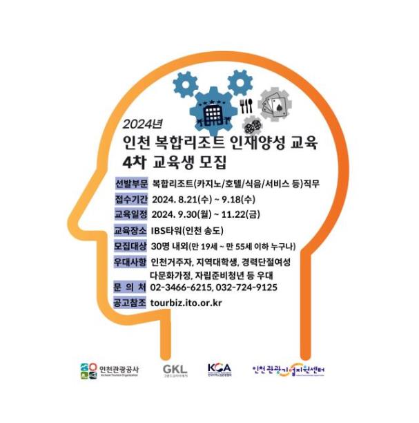 인천관광공사는 그랜드코리아레저(GKL)·한국카지노업관광협회와 함께 인천 관내 복합리조트 산업의 지속적 성장과 지역경제 활성화를 도모하고, 지역 전문 관광인재 양성을 통한 취업기회 제공 및 양질의 일자리 지원을 목적으로 본 교육생을 모집하오니, 많은 참여 바랍니다.
