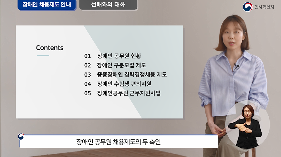 ‧ 장애인 채용제도 안내 01 장애인 공무원 현황 02 장애인 구분모집 제도 03 중증장애인 경력경쟁채용 제도 04 장애인 수험생 편의지원 05 장애인공무원 근무지원사업 |