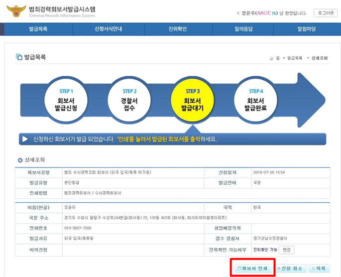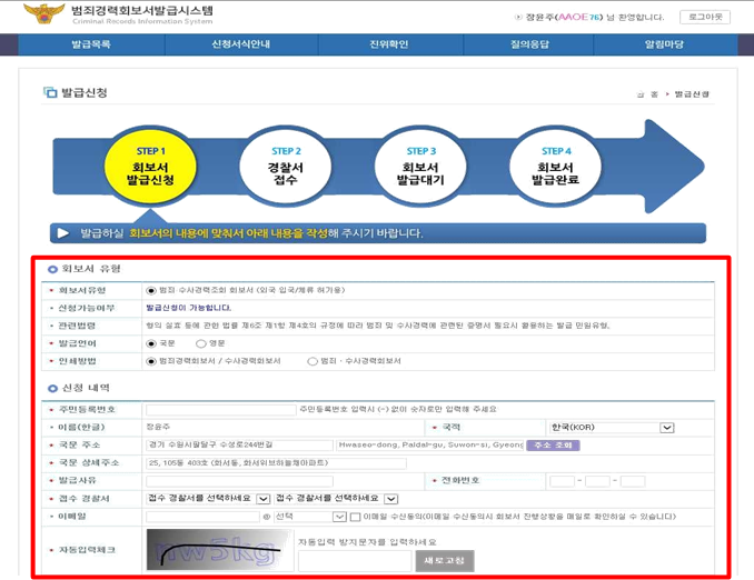 3. 정보기재 [인쇄방법] 범죄경력회보서/수사경력회보서 선택 . [발급사유] 반드시 ‘외국 입국/체류용’ 으로 기재 |