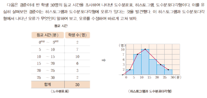 8. 중학교 1학년 통계 단원에서는 다양한 그래프 표현 방법을 지도하고 있다. 히스토그램의 유용성과 단점을 간략히 쓰고, 다음 내용은 중학교 수학 <자료와 가능성> 영역의 성취기준 적용 시 고려사항 중 어떤 내용을 반영하여 지도하는지 서술하시오. [3점]