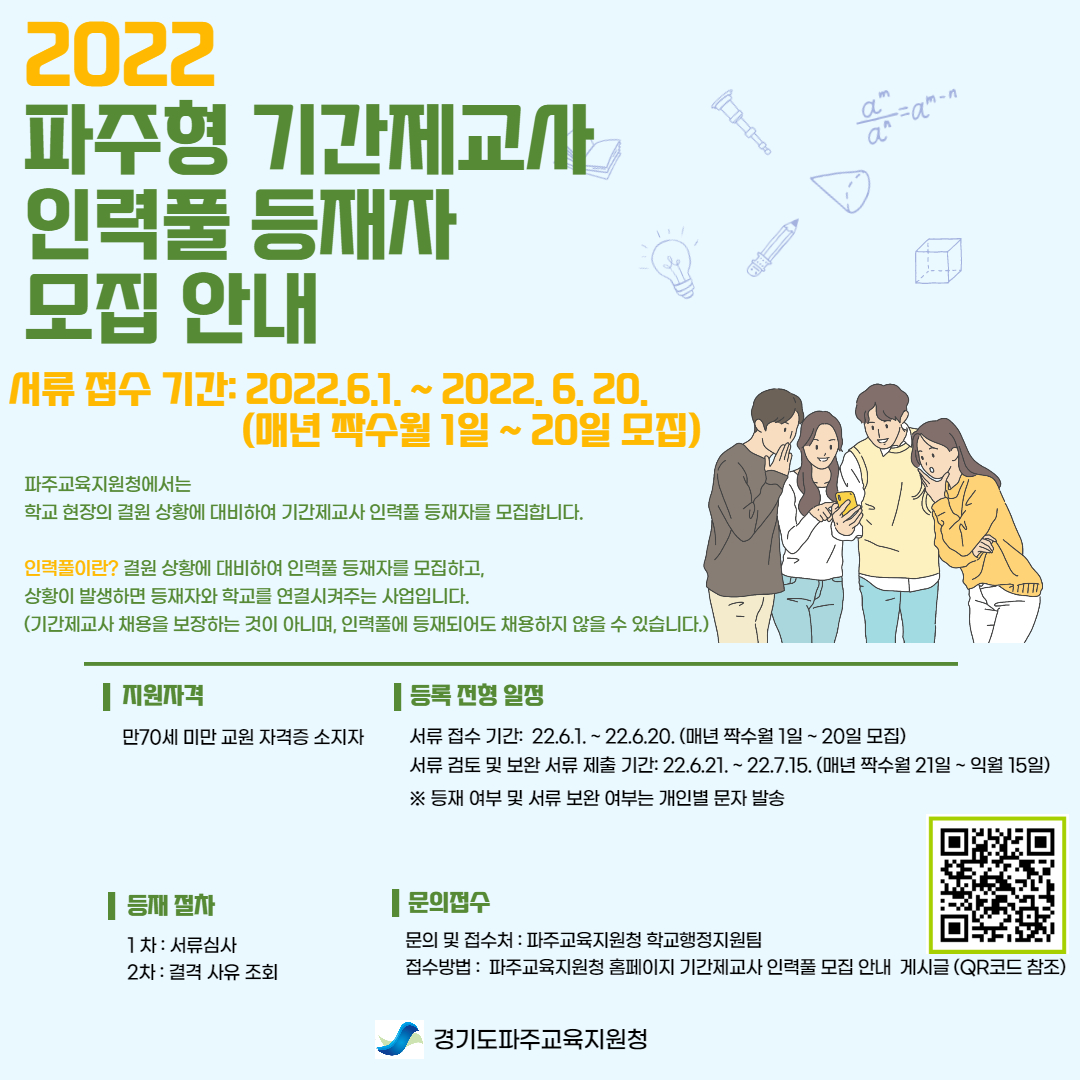 5. 경기도파주교육지원청에서 운영하는 인력풀을 통해 계약제교원으로 채용되더라도 추후 정규 교원으로 임용됨에 있어 어떠한 우선권도 인정되지 아니함을 알려 드립니다.