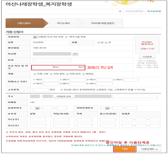 - 학년 및 학기 : 2018년에 진학하는 학년, 학기 입력