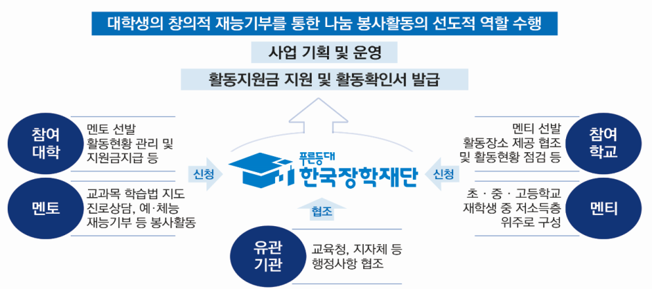 대학생 재능봉사 캠프 사업은 대학생이 주체적으로 봉사 프로그램을 기획하는 창의적 재능기부 사업으로서, 대학생 멘토가 청소년 멘티들을 대상으로 기획한 프로그램이 원활하게 운영될 수 있도록 지원 |