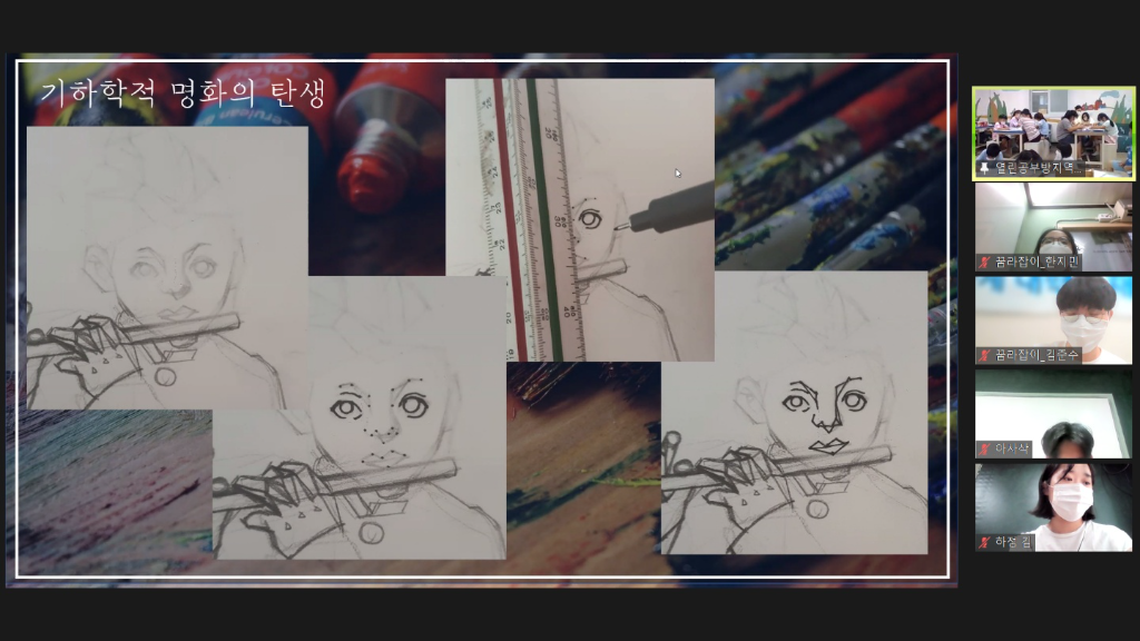 명화를 기하학적 도형과 상황표현으로 재해석하며 미적 감각과 응용력을 키우는 수업입니다. 기본 도형으로 아이들의 미적 소양의 수준을 확인하고 각자의 수준에 맞는 활동을 독자적으로 진행할 수 있었습니다. |