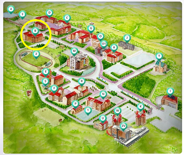 (1) 정문에서 정면에 보이는 대학 본부 건물까지 와서 오른쪽으로 걸어오면 왼편에 운동장이 보이고 운동장 끝나는 지점에 보이는 B 동 표시가된 3층 건물의 1층 우측 출입구 옆