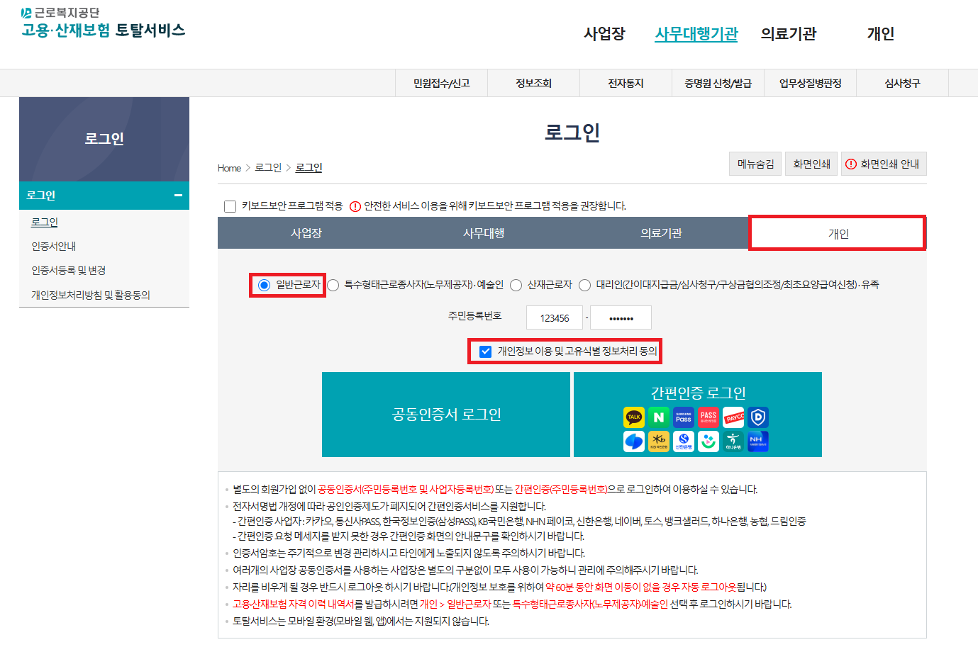➋ 개인 → 일반근로자 선택 ⟶ 간편인증 또는 공동인증서 이용 로그인