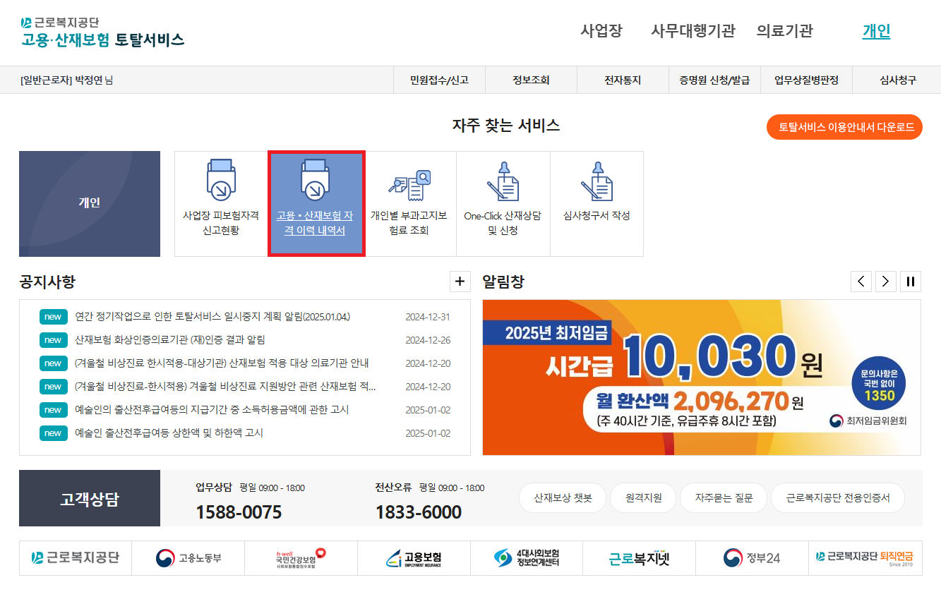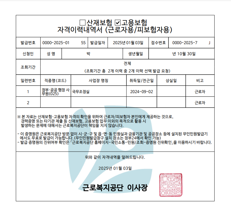 ➌ ‘고용⸱산재보험 자격 이력 내역서’ 선택
