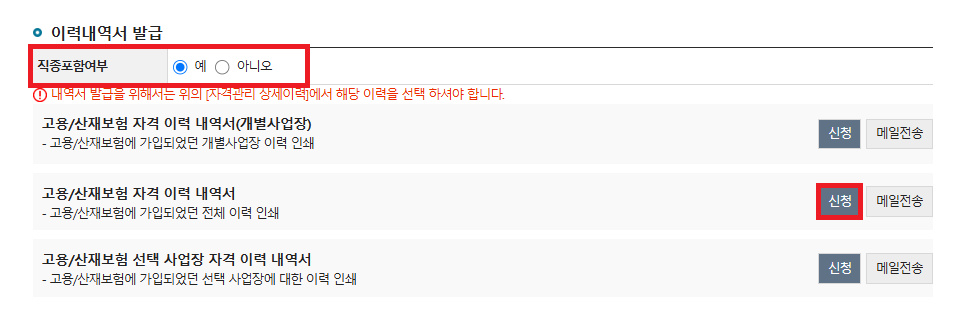 ➎ 직종포함여부 ‘예’ 선택 → ‘고용/산재보험 자격 이력 내역서(전체 이력 인쇄)’ 신청 선택
