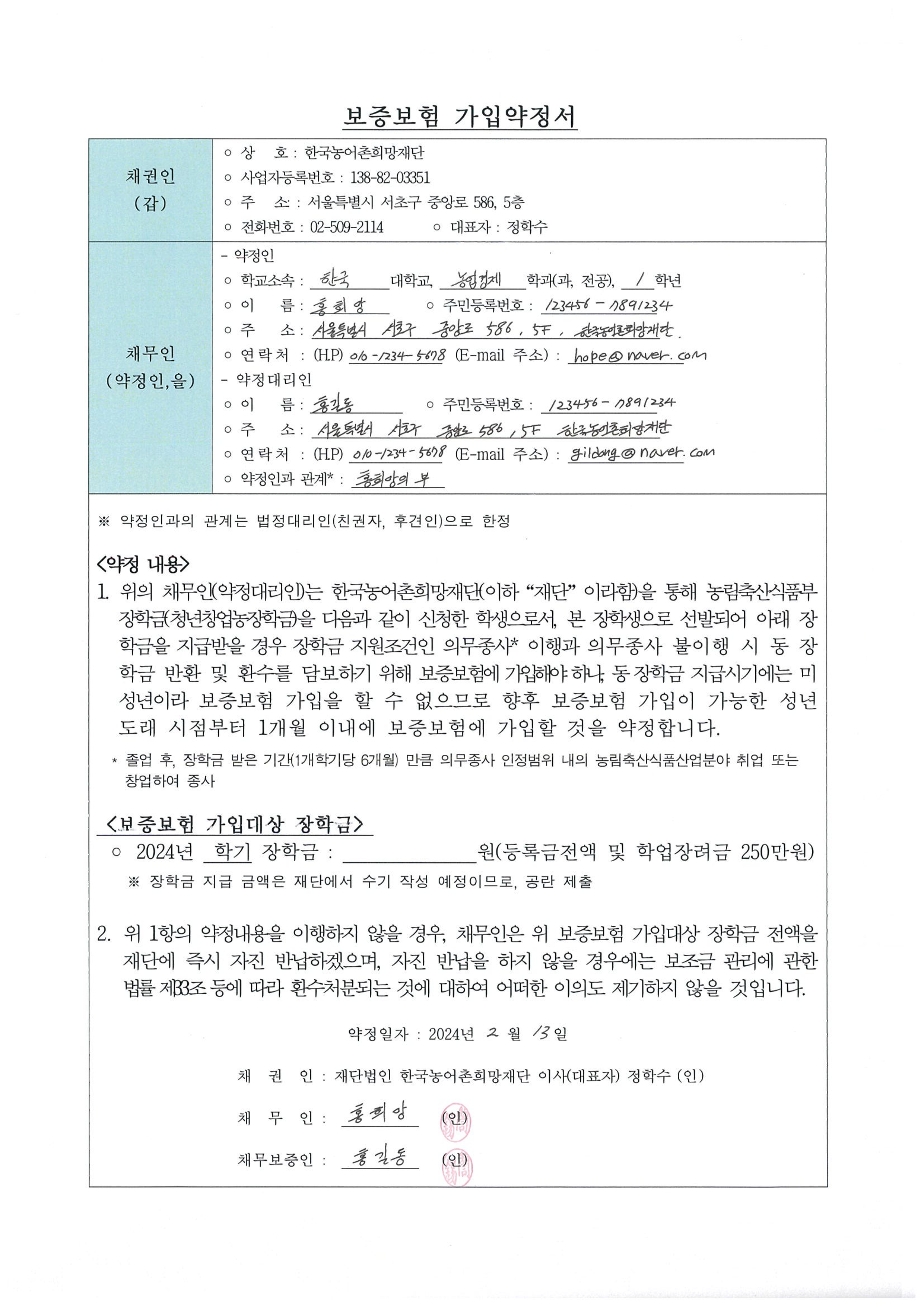 ※ 약정인과의 관계는 법정대리인(친권자, 후견인)으로 한정 <약정 내용> 1.위의 채무인(약정대리인)는 한국농어촌희망재단(이하“재단”이라함)을 통해 농림축산식품부 장학금(청년창업농장학금)을 다음과 같이 신청한 학생으로서, 본 장학생으로 선발되어 아래 장학금을 지급받을 경우 장학금 지원조건인 의무종사* 이행과 의무종사 불이행 시 동 장학금 반환 및 환수를 담보하기 위해 보증보험에 가입해야 하나, 동 장학금 지급시기에는 미성년이라 보증보험 가입을 할 수 없으므로 향후 보증보험 가입이 가능한 성년 도래 시점부터 1개월 이내에 보증보험에 가입할 것을 약정합니다. * 졸업 후, 장학금 받은 기간(1개학기당 6개월) 만큼 의무종사 인정범위 내의 농림축산식품산업분야 취업 또는 창업하여 종사 <보증보험 가입대상 장학금> ◦ 2024년 학기 장학금 : 원(등록금전액 및 학업장려금 250만원) ※ 장학금 지급 금액은 재단에서 수기 작성 예정이므로, 공란 제출 2.위 1항의 약정내용을 이행하지 않을 경우, 채무인은 위 보증보험 가입대상 장학금 전액을 재단에 즉시 자진 반납하겠으며, 자진 반납을 하지 않을 경우에는 보조금 관리에 관한 법률 제33조 등에 따라 환수처분되는 것에 대하여 어떠한 이의도 제기하지 않을 것입니다. 약정일자 : 2024년 월 일 채 권 인 : 재단법인 한국농어촌희망재단 이사(대표자) 정학수 (인) 채 무 인 : (인) 채무보증인 : (인) |