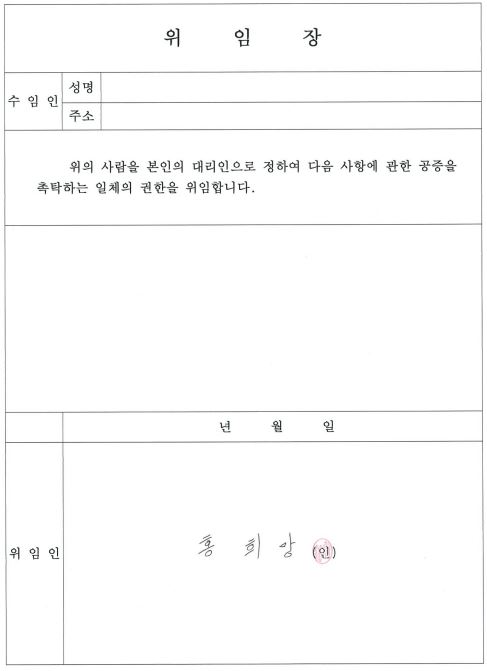 위의 사람을 본인의 대리인으로 정하여 다음 사항에 관한 공증을 촉탁하는 일체의 권한을 위임합니다. |