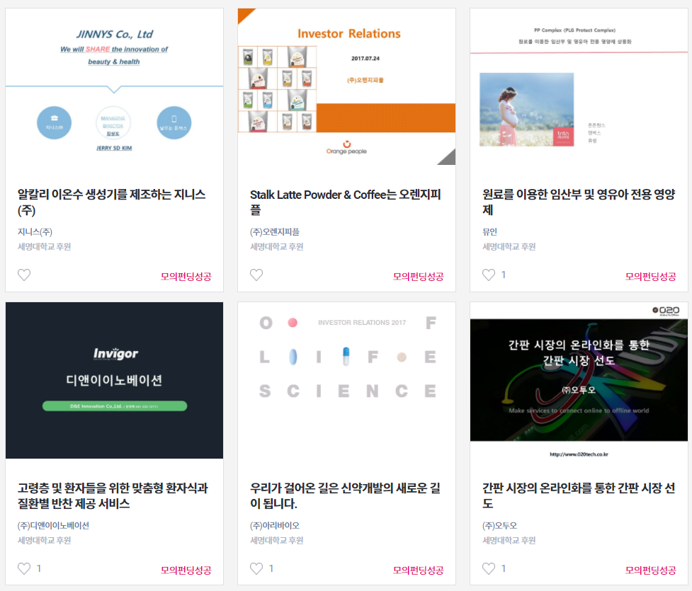- 목원대학교 창업팀의 사업계획서 및 사업소개자료를 업로드 방식에 의해 온라인상에서 모의 투자를 유치해 볼 수 있는 기회 제공