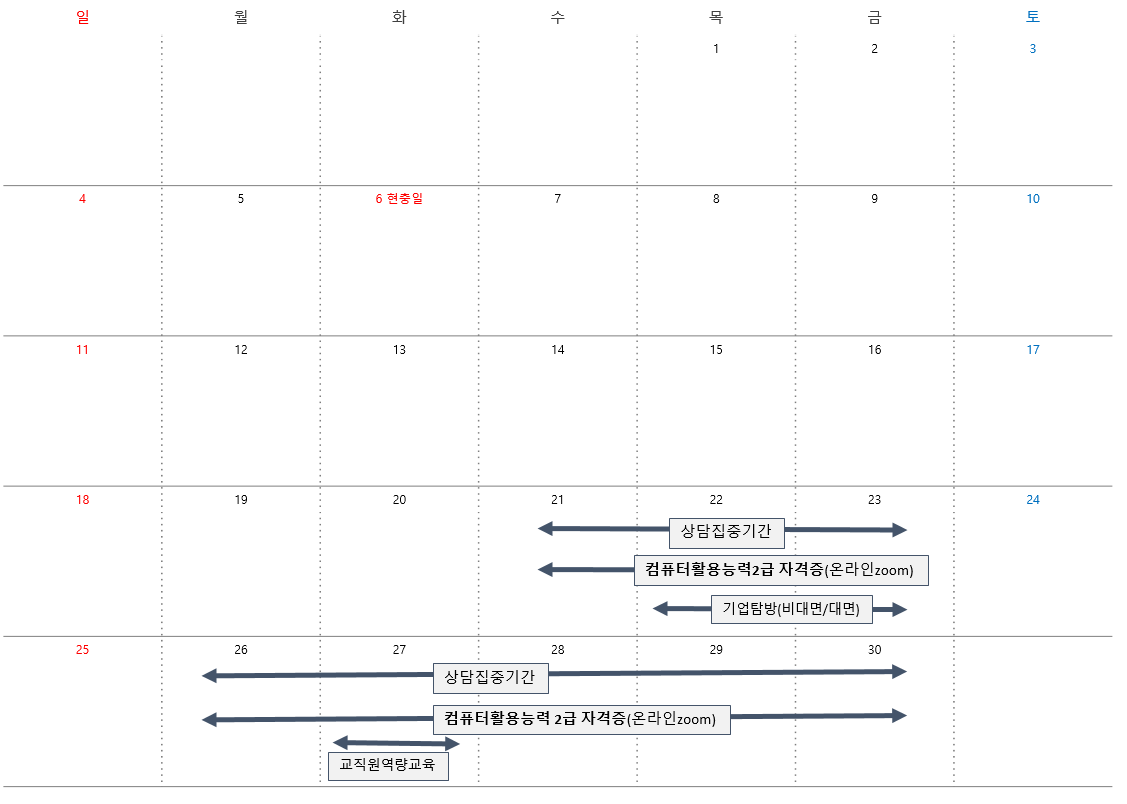 ★여름방학 진로·취업상담★ ▶ 방학중에도 진로·취업상담 운영합니다. ▶ 대 상 : 재학생 및 졸업생 ▶ 상담시간 : 평일 9:00 ~ 15:00 (점심시간 12:00~13:00) ▶ 여름방학 집중상담 기간 운영 - 기간 : 2023.06.21.(수) ~ 06. 30.(금) - 내용 : 8월 졸업예정자, 졸업생, 고학년 중심으로 상담을 진행하며 방학 중 입사서류 작성을 희망하는 학생 집중 상담실시 |